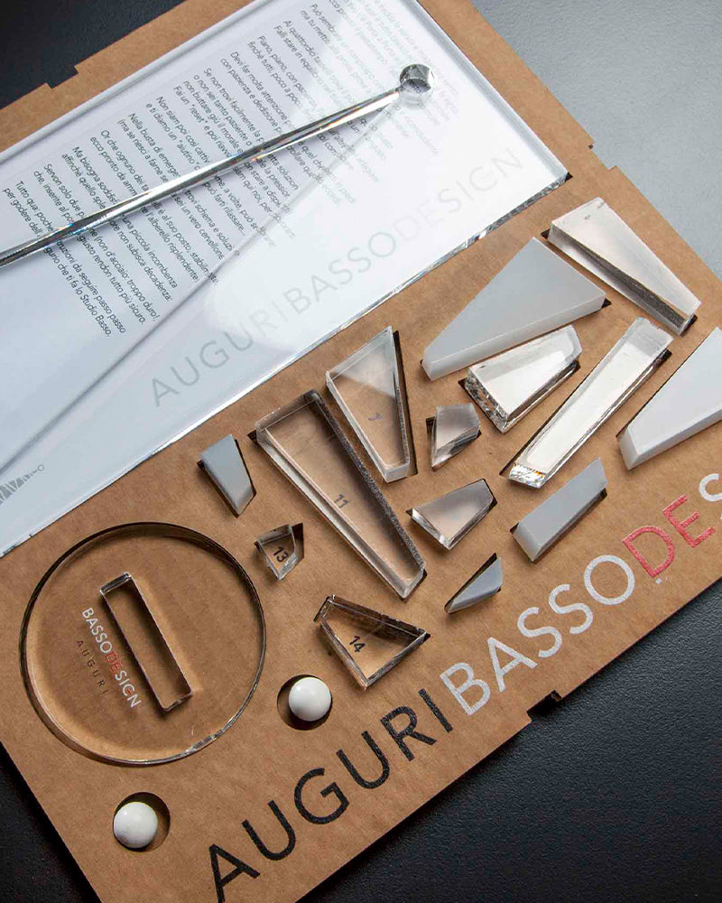 contenuto: 1 base tonda in plex, 1 lastra in plex, 14 elementi sagome in plex, 1 pallina di gomma, poesia e istruzioni